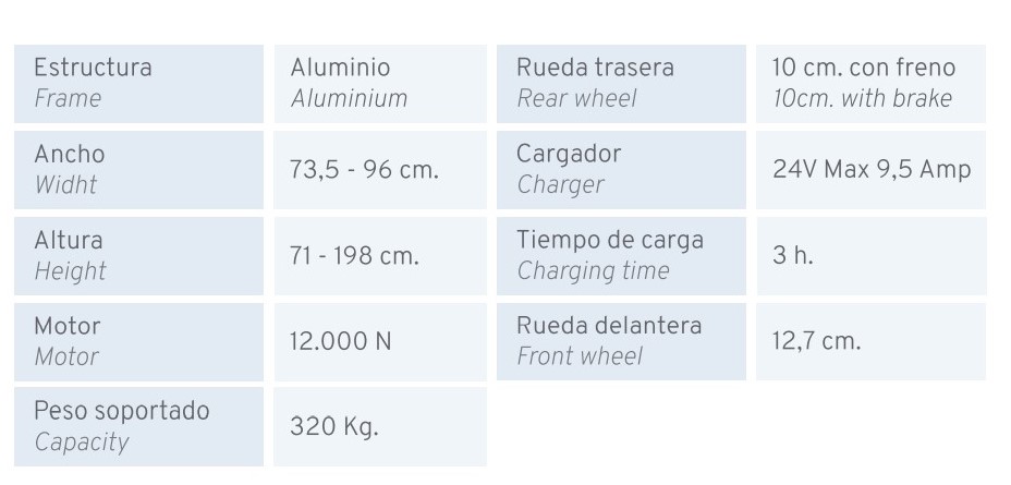 GRÚA DE TRASLADO DE PERSONAS CON PROBLEMAS DE MOVILIDAD. PESO MÁX: 320KGCARACTERÍSTICAS