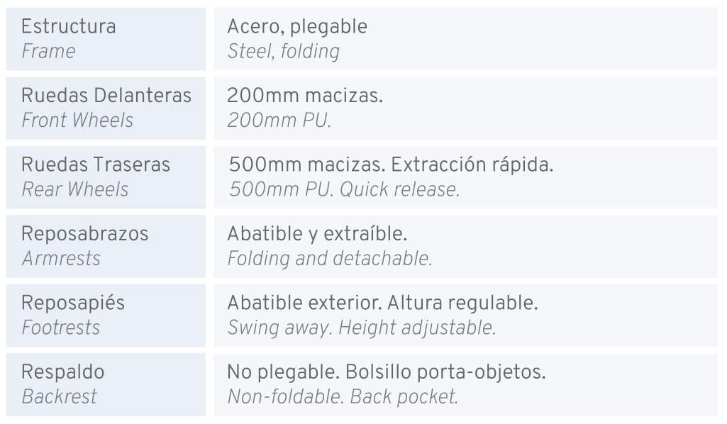 - Estrutura de aço dobrável com apoios de pés rebatíveis para fora e apoios de braços rebatíveis.