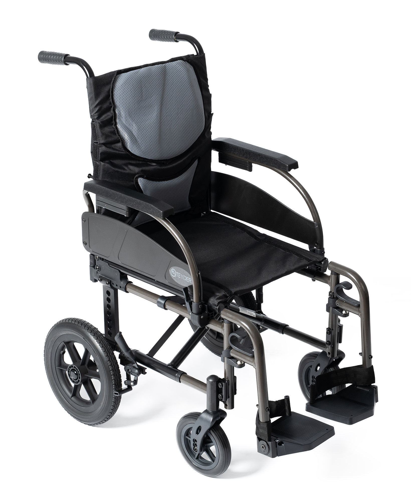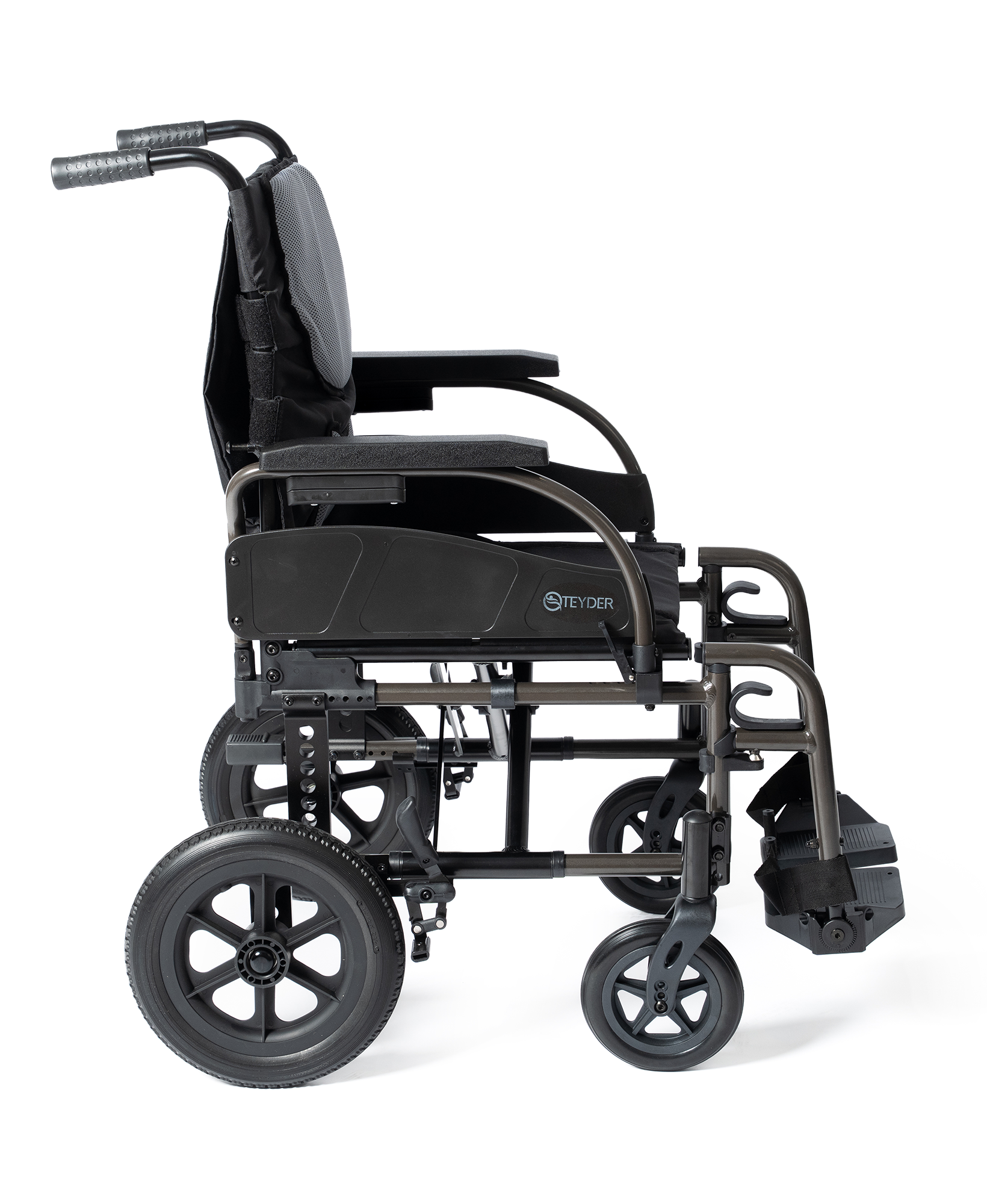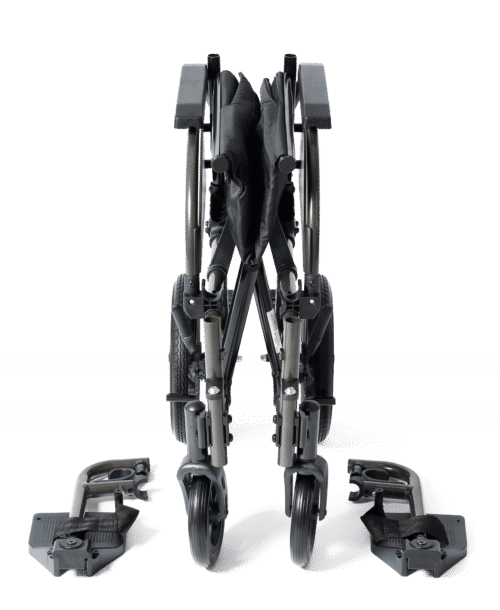 - Reposapiés abatibles y desmontables con soportes de talón.