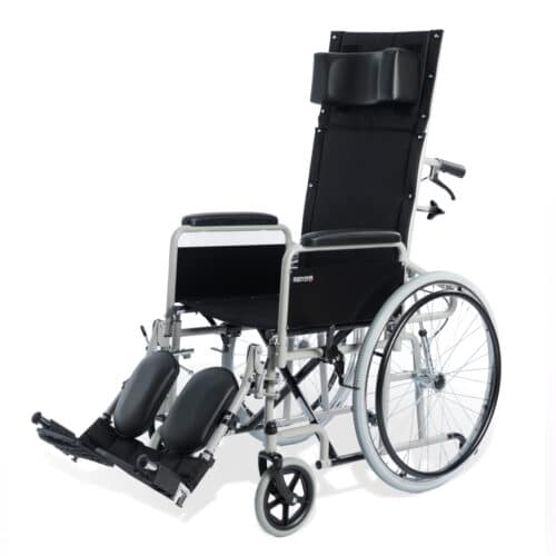 Sillas de ruedas reclinable auto-propulsable y plegable, incluye de serie los reposapiés elevables.